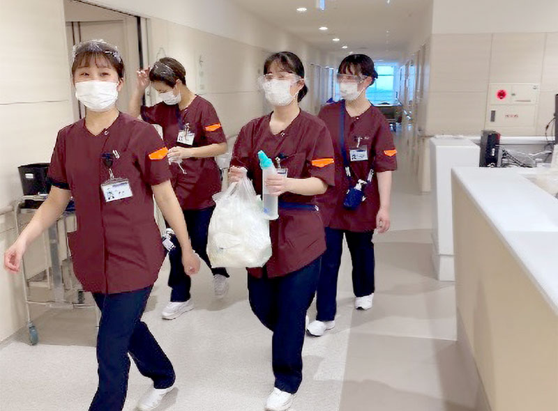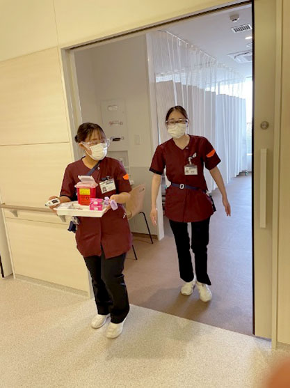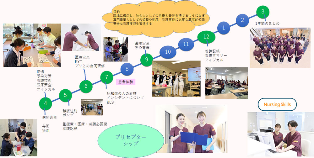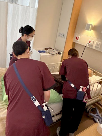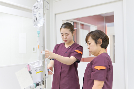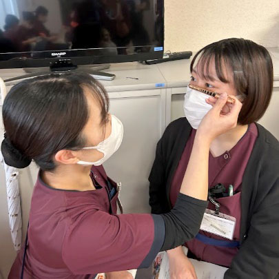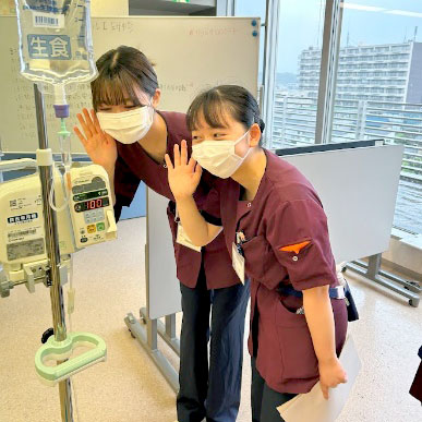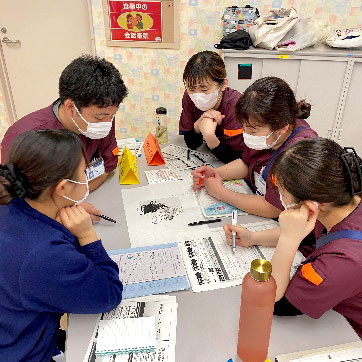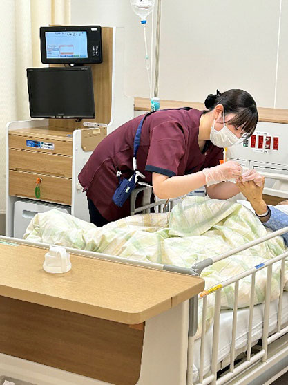 配属になる前に研修で学んだ知識と技術を経験します。1回目は他病棟、2回目は配属された病棟での研修です。プリセプターとともに実際の病棟で看護技術を体験することにより、病棟の雰囲気も知ることができ不安の軽減を図ることもできています。研修後はプリセプターを交えて振り返りをすることで課題を共有し、実践で役立つ研修となっています。
