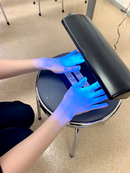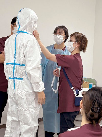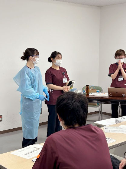 感染管理認定看護師による感染対策研修では、実際にPPE着脱や手指消毒の技術を学びます。現場ですぐ活用する手技であるため、習得するまで何度も繰り返し練習をします。状況に応じた対策を自身で選択できるよう、考える力を養います。